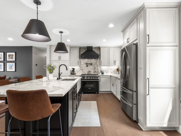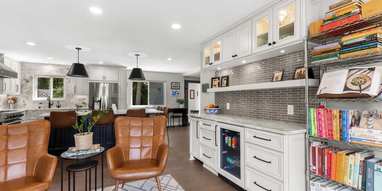 Designed with a busy family in mind, this kitchen and bar strike the perfect balance between function and style. The expansive island serves as the hub for meals, homework, and gatherings, while sleek cabinetry and thoughtful storage keep everything organized and within reach. The bar area elevates the space with a touch of sophistication, offering a convenient spot for morning coffee or evening entertaining. With clean lines, modern finishes, and warm details, this remodel reflects great taste while supporting the rhythm of everyday family life.