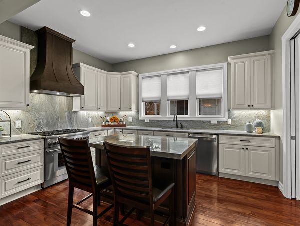 This stunning remodel features custom white cabinetry, a dramatic dark hood, and a functional mudroom with a luxurious quartzite benchtop, blending elegance and utility