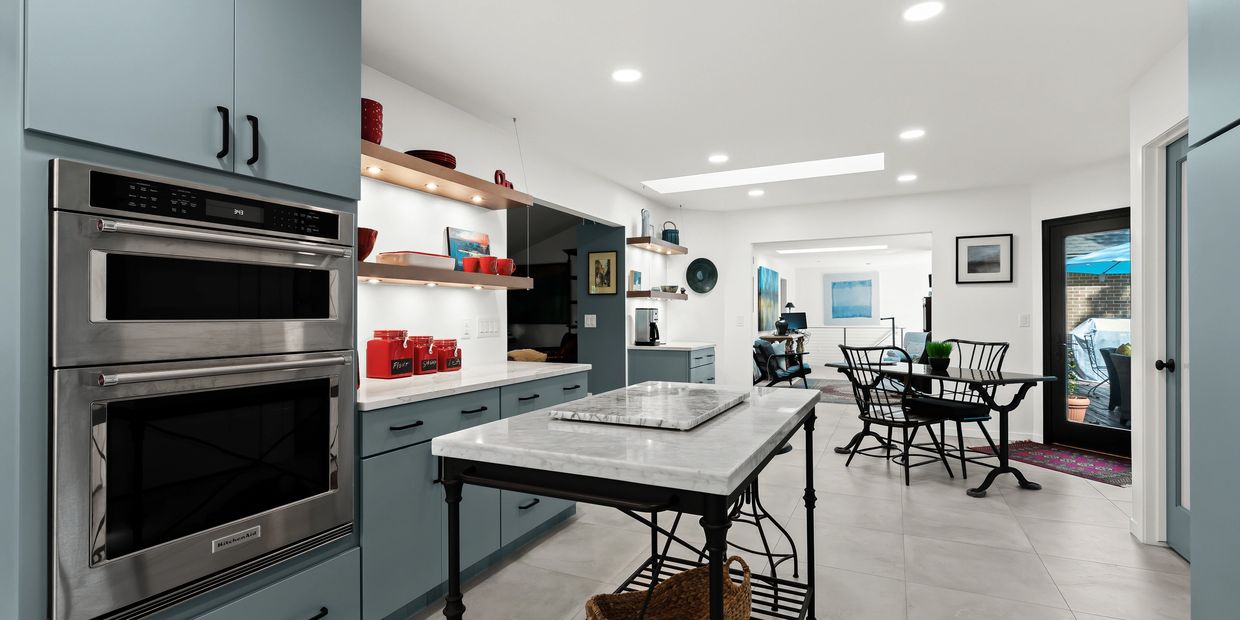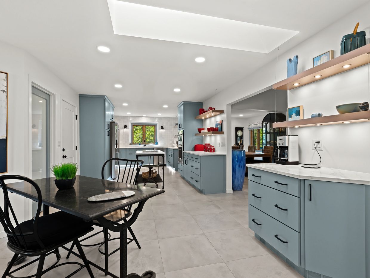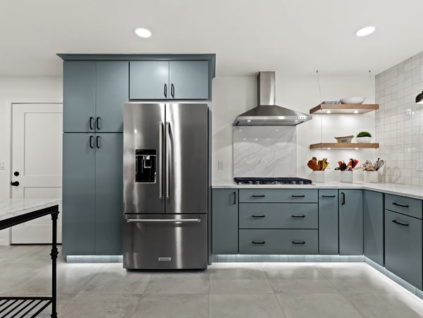 This full kitchen remodel brought new life and personality into the heart of the home. The outdated layout was transformed into a bright, modern space with clean lines and bold design choices. Custom cabinetry in a soft blue tone creates a calming backdrop, while sleek black hardware adds contrast and definition. Warm wood floating shelves showcase colorful accents and everyday essentials, while under-shelf lighting highlights both function and style.