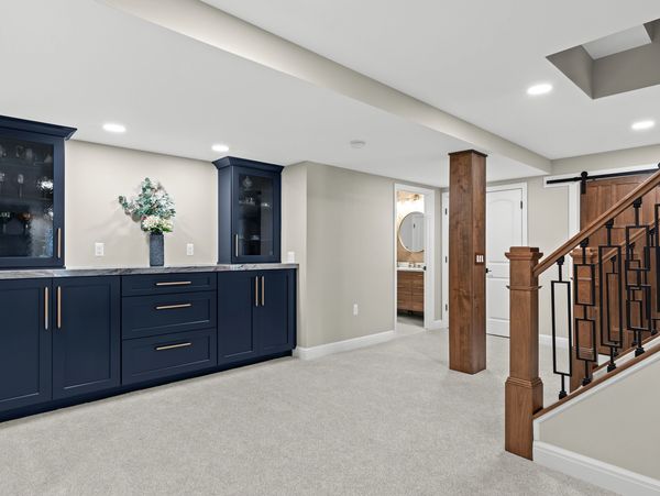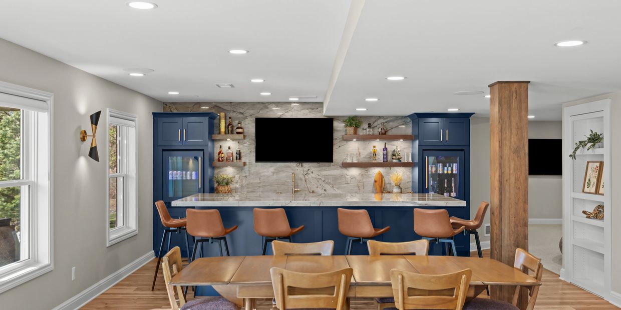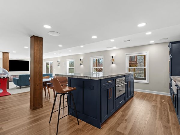 This basement remodel is a complete transformation, creating a stylish and highly functional living space built for both relaxation and entertaining. The open floor plan centers around a full-functioning bar and kitchen, equipped with elegant navy cabinetry, a stunning island, and